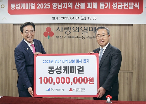 ▲ 동성케미컬은 최근 영남 지역에서 발생한 산불로 피해를 본 주민을 지원하기 위해 부산사회복지공동모금회에 성금 1억원을 기탁했다고 8일 밝혔다. 동성케미컬은 2016년부터 국가적 재난·재해가 발생할 때마다 성금을 기부하는 등 도움이 필요한 이웃을 지원하고 있다. 백정호 동성케미컬 회장은 "지속적인 사회공헌 활동을 통해 기업의 사회적 책임을 다하겠다"고 말했다. (서울=연합뉴스)