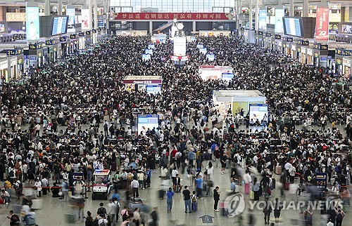(서울=연합뉴스) 이봉석 기자 = 중국 노동절 황금연휴(1∼5일) 지역 간 이동인구가 연인원 14억6천만명을 넘어 예상치를 웃돈 것으로 나타났다.