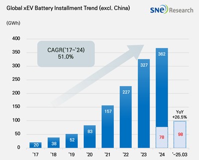 9일 에너지 전문 시장조사업체 SNE리서치에 따르면 올해 1∼3월(1분기) 중국 시장을 제외한 세계 각국에 등록된 순수전기차·플러그인하이브리드차(PHEV)·하이브리드차(HEV)에 탑재된 배터리 총사용량은 약 98.4GWh(기가와트시)로 지난해 같은 기간보다 26.5% 증가했다.