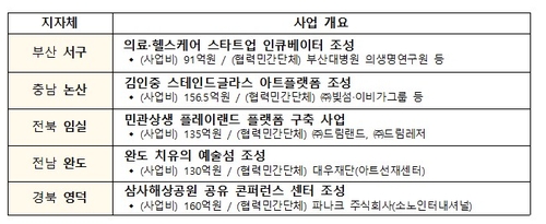 올해에는 총 21개 기초지자체에서 사업을 신청해 부산 서구·충남 논산·전북 임실·전남 완도·경북 영덕이 최종 선정됐다. 지역 산업자원과 창업 생태계 구축을 접목하고, 문화자원과 휴양·힐링을 연계하면서 관광자원의 특화를 추진해 지역 활력을 높일 수 있는 사업들을 뽑았다.