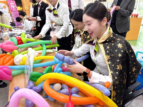 ▲ 진에어는 지난 15∼16일 서울 마포구 푸르메재단 넥슨어린이재활병원에서 객실 승무원들이 사회 공헌 활동을 했다고 19일 밝혔다. 이번 활동에 참여한 진에어 딜라이트 지니 이벤트 특화팀은 동요·마술 공연, 퀴즈 게임 등 어린이 환자를 위한 프로그램을 진행하고, 치료 교구 소독 작업도 했다. (서울=연합뉴스)