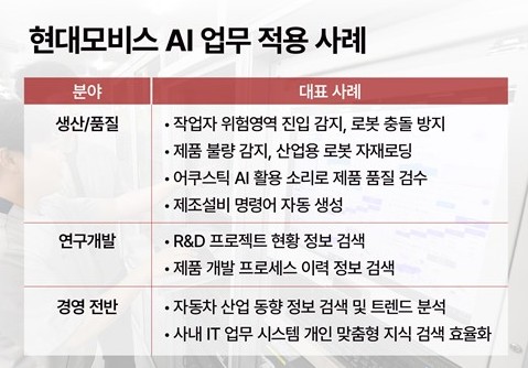 현대모비스는 국내 사업장에 작업자의 위험영역 진입을 감지하고, 로봇과 충돌을 방지하는 안전 감지 AI 모델을 도입한 바 있다. 또 AI가 소리를 인식해 제품의 품질 정확도를 판단하는 '어쿠스틱 AI 시스템'도 개발해 생산 현장에 적용 중이다.