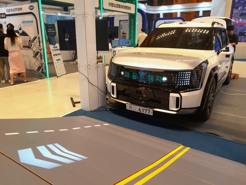 (서울=연합뉴스) 임성호 기자 = 한국교통안전공단(TS)은 19일 서울 강남구 코엑스에서 열린 '2025 국토교통기술교류회'에서 자율주행차 주행 상태를 보행자에 전달하는 'V2H(Vehicle to Human) 커뮤니케이션' 기술을 선보였다고 밝혔다.