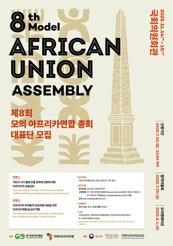 ▲ 한·아프리카재단(이사장 김영채)과 국회아프리카포럼(회장 이헌승 의원)은 이달 20일까지 '제8회 모의 아프리카연합(AU) 총회'에 참가할 대표단을 모집한다. 아프리카에 관심이 많은 대한민국 청년이 '2인 1팀'으로 신청할 수 있다. 올해 모의 AU 총회는 11월 14∼15일 국회 의원회관에서 열린다. 총회 의제는 '식민지 시기 불법 반출 문화재 반환에 대한 아프리카의 공동입장'과 '아프리카의 비전통적 안보 위협 대응을 위한 아프리카연합의 역할'이다. (서울=연합뉴스)
