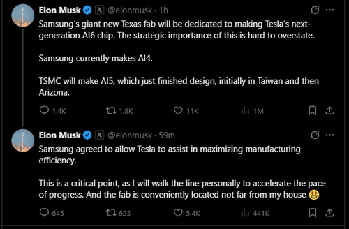 머스크는 또 이에 앞서 올린 게시물에서 "삼성의 텍사스 대형 신공장은 테슬라 차세대 AI6 칩 생산에 전념하게 될 것"이라며 "이 전략적 중요성은 아무리 강조해도 지나치지 않다"고 말했다.