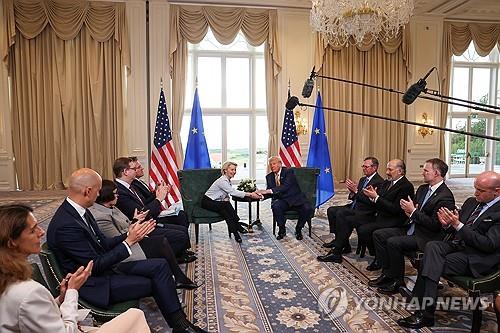 트럼프 대통령과 폰데어라이엔 위원장은 이날 회담을 통해 미국으로 수출되는 EU 제품에 대한 상호관세율을 15%로 정하는 무역 합의를 타결했다.