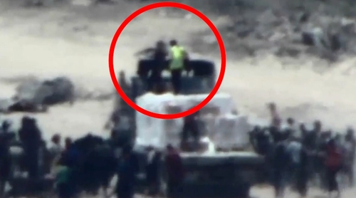 지난 25일 촬영됐다는 이 감시카메라 영상을 보면 소총을 멘 남성 2명이 트럭에 실린 구호품 상자 위에 올라서서 주변으로 몰려든 사람들에게 손짓한다. 한 남성이 일부 군중을 향해 조준사격을 하는 듯한 동작도 보인다.