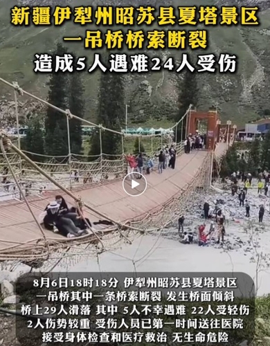 7일(현지시간) 중국매체 펑파이·글로벌타임스에 따르면 전날 신장 웨이우얼(위구르)자치구 이리 하싸커(카자흐)자치주 샤타(夏塔) 관광지에서 발생한 사고로 다리 위에 있던 관광객들이 아래로 떨어지면서 5명이 숨지고 24명이 다쳤다.