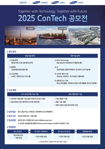 (서울=연합뉴스) 김보경 기자 = 삼성중공업은 삼성물산 건설부문, 삼성E&A와 함께 설계·시공·조달 분야 혁신 기술을 발굴을 위한 '2025 콘테크 공모전'을 연다고 11일 밝혔다.
