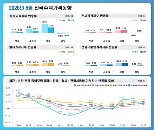 15일 한국부동산원이 발표한 8월 전국 주택가격 동향 조사 결과에 따르면 서울의 주택종합(아파트·연립주택·단독주택 포함) 매매가격지수는 전월(7월) 대비 0.45% 상승했다.