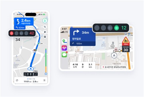 네이버 지도 앱, 카플레이, 안드로이드 오토 환경에서 목적지를 설정하면 화면 상단에서 실시간 신호등 정보를 볼 수 있다.