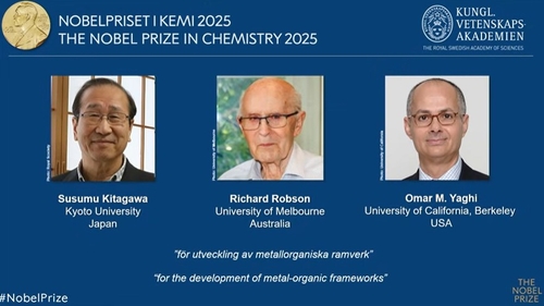 (서울=연합뉴스) 임화섭 신창용 기자 = 올해 노벨화학상은 금속·유기 골격체를 개발한 기타가와 스스무 일본 교토대 교수, 리처드 롭슨 호주 멜버른대 교수, 오마르 M. 야기 미국 UC버클리대 교수 등 3인에게 돌아갔다.