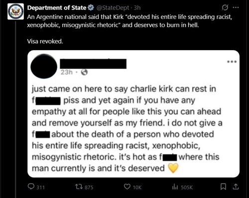 국무부가 게시한 글에 따르면 이번에 비자가 취소된 아르헨티나인은 커크에 대해 "인종차별, 외국인 혐오, 여성 혐오 수사를 확산하는 데 평생을 바쳤다"고 썼다.