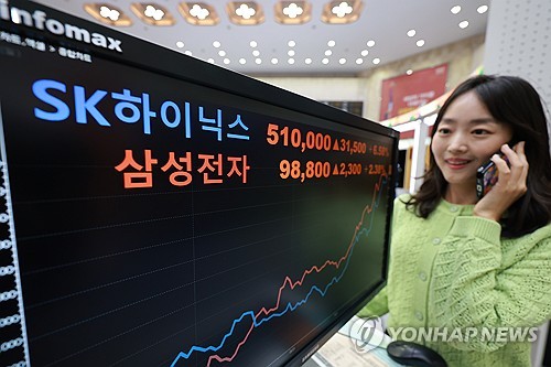 이날 삼성전자는 전장보다 2.38% 오른 9만8천800원에, SK하이닉스는 6.58% 급등한 51만원에 장을 마쳤다.