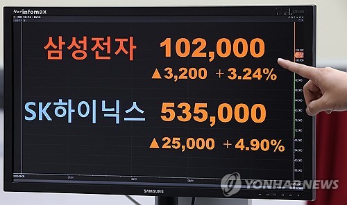 코스피가 4,000을 돌파한 지난 27일 삼성전자는 10만2천원에 장을 마치며 사상 처음으로 10만원 선을 넘었다. SK하이닉스도 53만5천원으로 신고가를 경신했다.