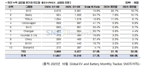 그룹별로는 중국 BYD(비야디)가 10.6% 늘어난 296만1천대로 글로벌 전기차 판매 1위 자리를 유지했다. 점유율은 19.7%였다.