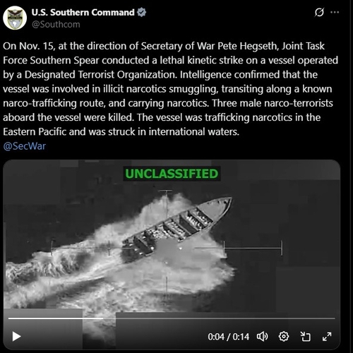 미 남부사령부(SOUTHCOM)는 16일(현지시간) 엑스(X·옛 트위터) 계정에 "피트 헤그세스 전쟁부(국방부) 장관의 지시에 따라 11월 15일 합동 태스크포스 '서던 스피어'(Southern Spear)는 지정 테러 조직(DTO)이 운영하는 선박에 대해 치명적인 물리적 공격을 수행했다"고 밝혔다.