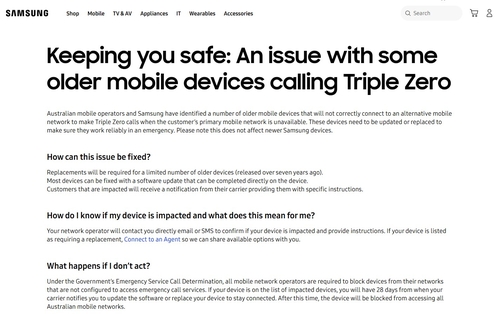 삼성전자도 웹사이트를 통해 일부 구형 모바일 기기가 유사시 000 긴급통화에 제대로 연결되지 않는 것을 발견했다고 공지했다.