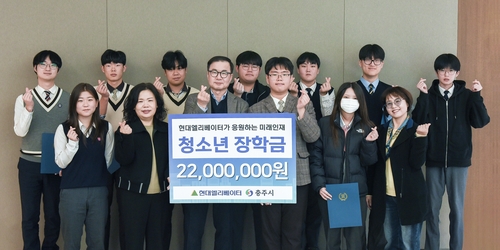 ▲ 현대엘리베이터는 충북 충주 고등학생 22명에게 각 100만원의 장학금을 전달했다고 20일 밝혔다. 현대엘리베이터는 2009년부터 17년째 지역인재를 선발해 장학금을 전달하고 있다. 조재천 현대엘리베이터 대표이사는 "학생 여러분들의 꿈과 가능성, 미래를 그릴 수 있는 오늘이길 바란다"며 "현대엘리베이터는 청소년 교육 지원을 위해 필요한 프로그램을 마련하는 등 적극 협력하겠다"고 말했다. (서울=연합뉴스)