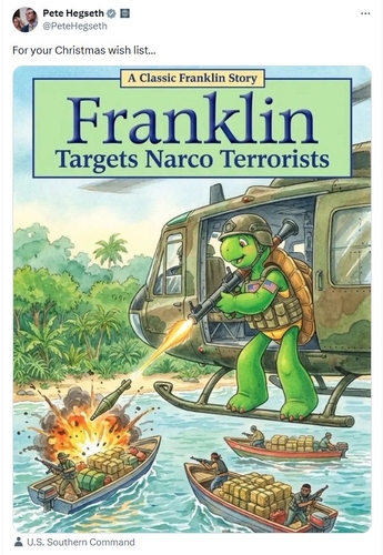 (서울=연합뉴스) 고일환 기자 = 동화책 '꼬마 거북 프랭클린'의 주인공이 마약선을 격침하는 이미지를 엑스(X·옛 트위터)에 올린 피트 헤그세스 미국 국방부 장관이 출판사의 항의를 받았다.