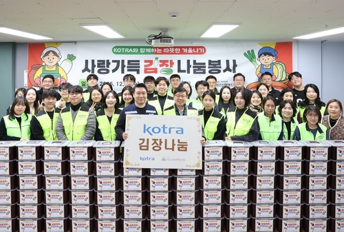 ▲ 대한무역투자진흥공사(코트라)는 지난 3일 서울 서초구에서 사내 봉사동아리 '레프트핸즈'가 중심이 돼 서초구어르신행복e음센터와 함께 '노사 합동 김장 나눔 봉사' 활동을 진행했다고 4일 밝혔다. 이날 코트라 임직원 30여명은 직접 담근 김장김치 300포기(640㎏)를 독거노인 등 도움이 필요한 어르신이 있는 80가구에 전달했다. (서울=연합뉴스)
