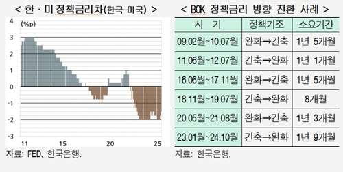 연구원은 "과거 예로 미뤄 금리 인하 사이클이 종결되더라도 즉각적 방향 전환(금리 인상 사이클 시작)을 의미하는 것은 아니지만, 국내 시장 금리가 이를 선반영해 하방 경직성이 나타나면서 소비·투자의 실물 경기 회복에 부정적 영향을 미칠 것"이라고 설명했다.