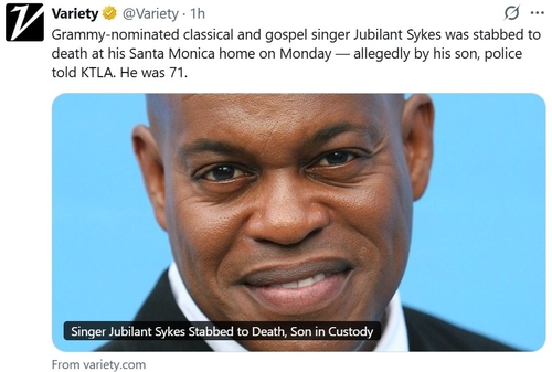 (로스앤젤레스=연합뉴스) 임미나 특파원 = 그래미상 후보로 지명된 이력이 있는 미국의 오페라 가수 주빌런트 사이크스(71)가 자택에서 흉기에 찔려 숨졌다고 KTLA와 NBC 등 현지 매체들이 9일(현지시간) 전했다.