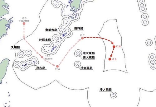 이어 전날까지는 오키나와현 동쪽 섬인 미나미다이토지마(南大東島) 주변을 시계 방향으로 나아가며 'S자 형태'로 포위하듯 이동했다.