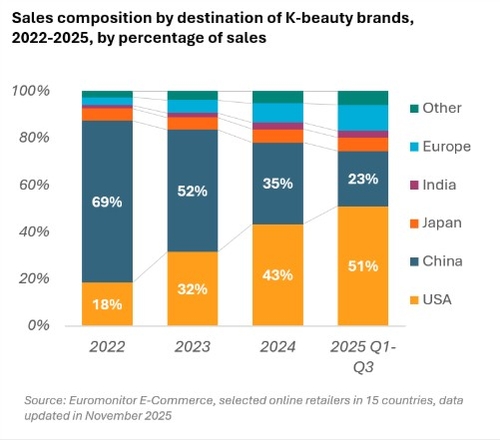K-뷰티 온라인 판매액 비중을 국가별로 보면 2023년에는 중국이 52%로 미국(32%)보다 높았지만, 작년에는 미국이 43%로 중국(35%)을 앞질렀다.