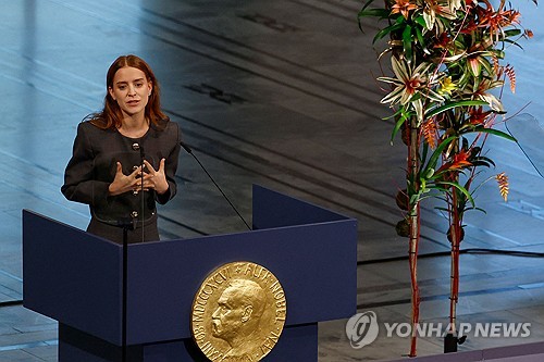 (브뤼셀=연합뉴스) 현윤경 특파원= 올해 노벨평화상 수상자인 베네수엘라 야권지도자 마리아 코리나 마차도(58)가 10일 오후 노르웨이 오슬로에서 열린 시상식에 끝내 모습을 드러내지 못했다.