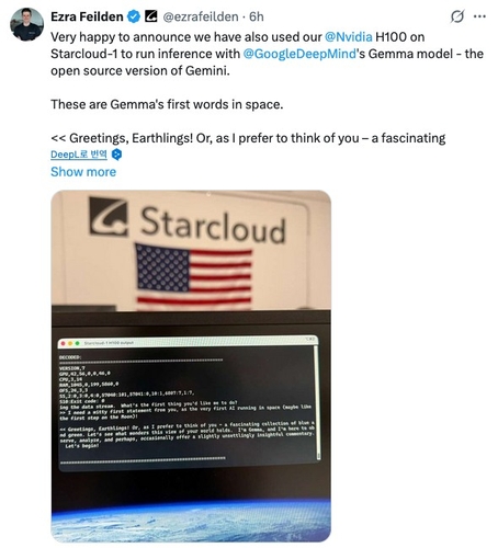 스타클라우드는 지난달 2일 엔비디아의 그래픽처리장치(GPU) 'H100'을 탑재한 위성 '스타클라우드-1'을 궤도에 올려 이 AI 모델을 훈련하고 구동했다.