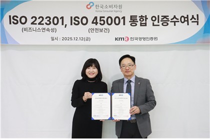 (서울=연합뉴스) 조민정 기자 = 한국소비자원은 안전보건 경영시스템(ISO 5001)·비즈니스 연속성 경영시스템(ISO 22301) 인증을 동시에 받았다고 12일 밝혔다.